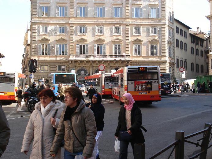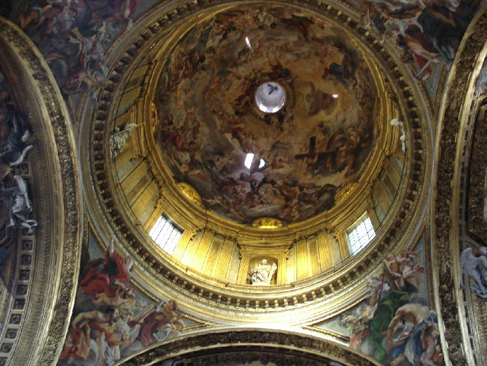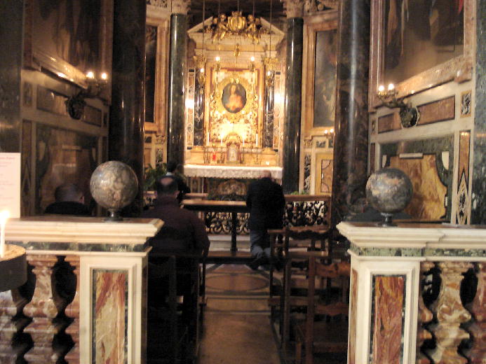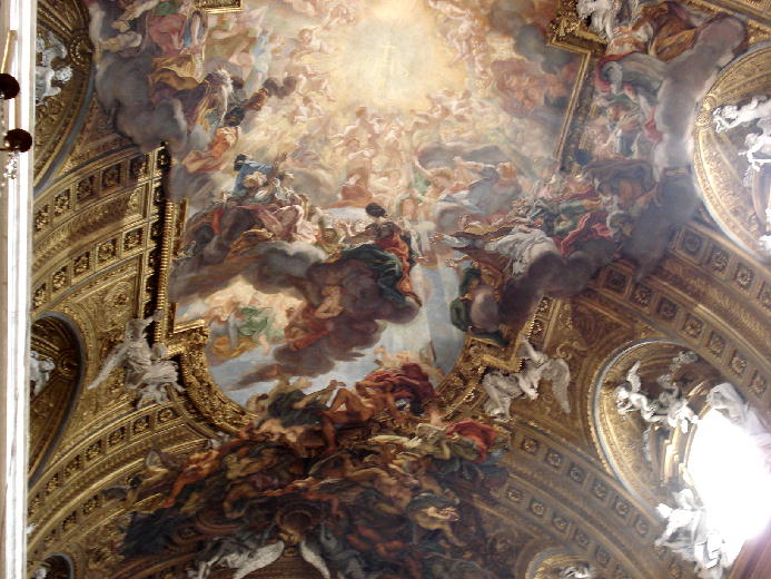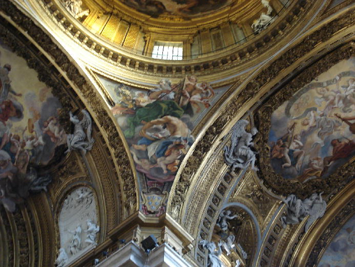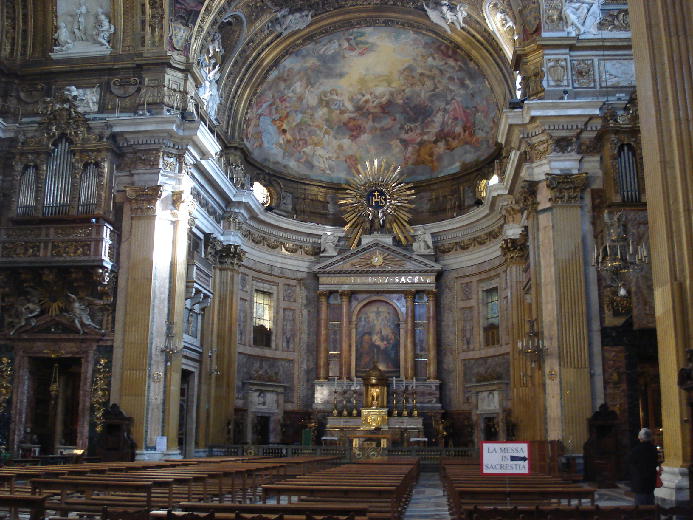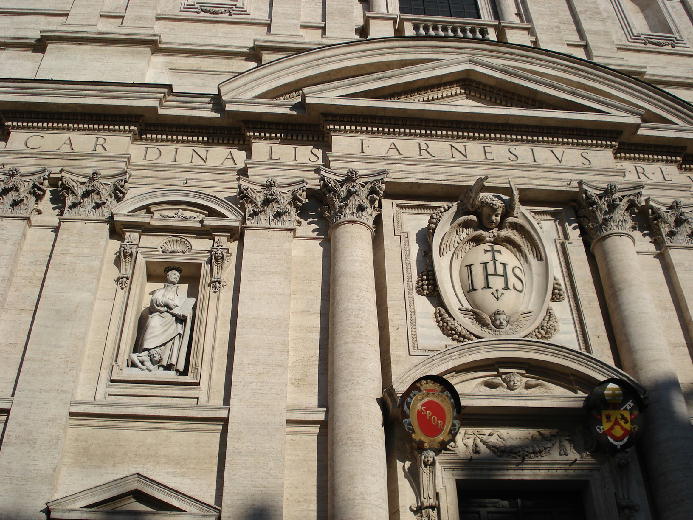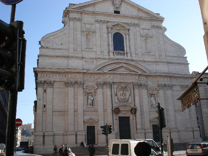 東京でいえば銀座通りにあたるのが、ローマでは、コルソ通りです。そのコルソ通りの近くのラルゴ・アルジェンティーナでバスを降りると、道の向こうに半分姿が見えるのがジェズ教会です。「ジェズ」の名のとおり、イエズス会の教会で、母教会として1568年から75年かけて建設されました。