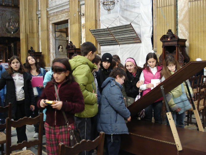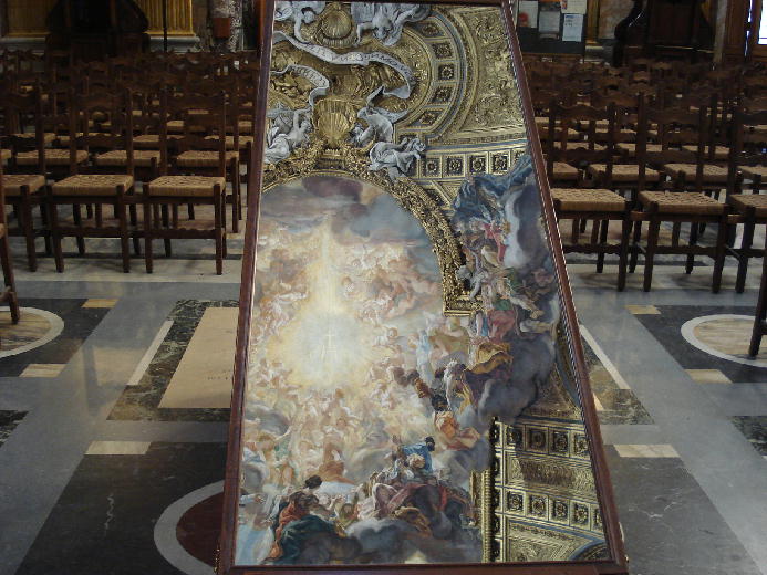 「あのね、ここはだまし絵で有名な教会だって」一緒に行ったシスターが教えてくれました。そういえば、観光客のみなさんは、ガイドが指さす天井を見上げています。彼らの視線の先を追うと……、おお、すごい! 天井いっぱいの絵、絵、絵……、すばらしい絵の世界が広がっています。よくよく見るのですが、分かりません。彫刻なのか、絵なのか、見ていて飽きないです。上を見て首がいたくならないように、中央に大きな鏡が置かれていました。子どもたちも先生とやってきて、この鏡をのぞいていました。