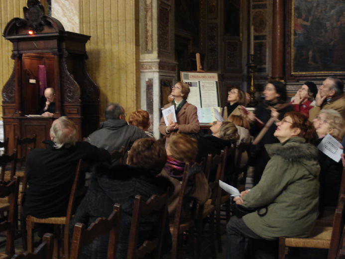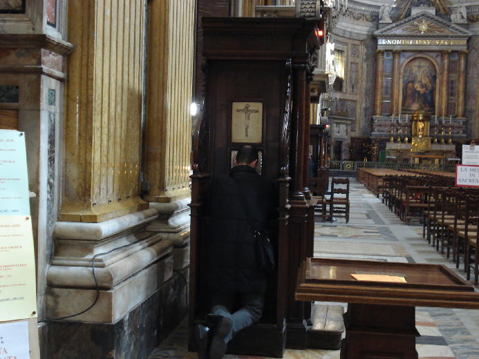 ドアを開けて、聖堂内に入るとすぐ見えるのが、ゆるしの秘跡を受けている人の後ろ姿でした。そこから目を転じていくと、奥行きの広い聖堂のなかが見えてきます。祈る人があちらこちらに見えました。平日の昼間に、見学のためでなく、祈る人がいることにちょっと驚いてしまいました。右手を見ると、ああ、やはり観光客の一団がいました。