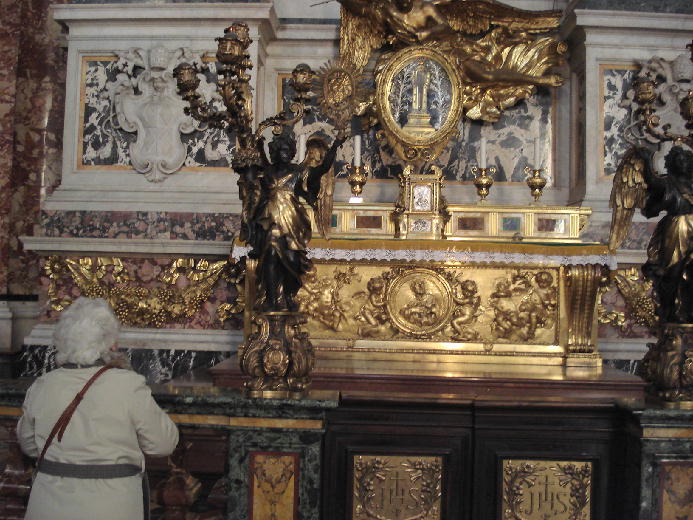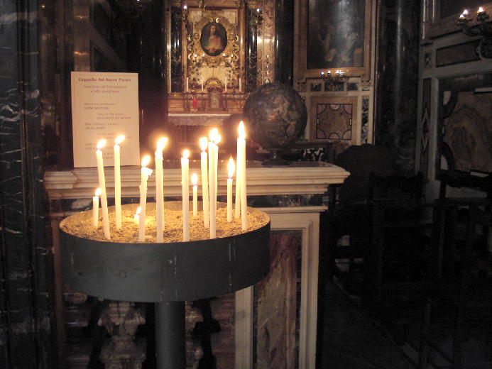ザビエルの右手の前を通って、祭壇の右手に進むと、聖櫃(せいひつ)の前の小さな祈りの空間がありました。祈りのためのローソクがささげられていました。何人もの人がイスに座って一心に祈っていました。いつまでもここで祈っていたい、そんな思いにさせる聖なる祈りの場でした。こうして人々が祈りにやってくる聖堂は、“生きている”と感じます。