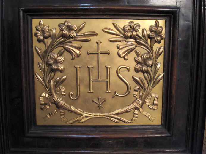 正面の壁、フォッサードの中央には大きな「ジェズ」のマーク「JHS」が書かれています。このマーク、聖堂内の至るところについていました。